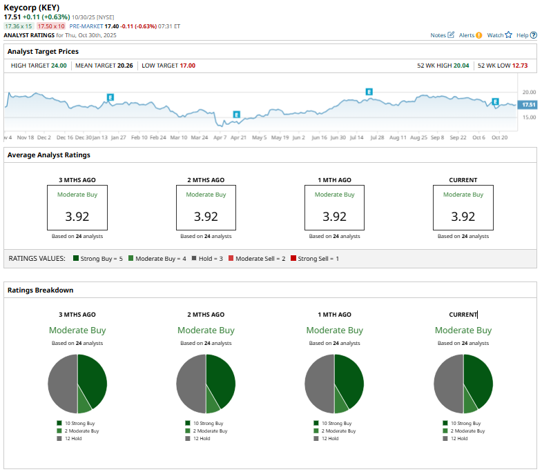 On Oct. 17, DA Davidson lowered its price target on KeyCorp from $22 to $21 while maintaining a “Buy” rating, noting strong Q3 2025 results and higher full-year revenue guidance but suggesting that these positives are already reflected in consensus estimates.