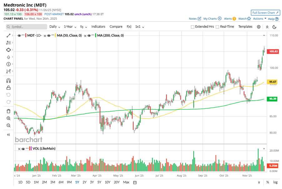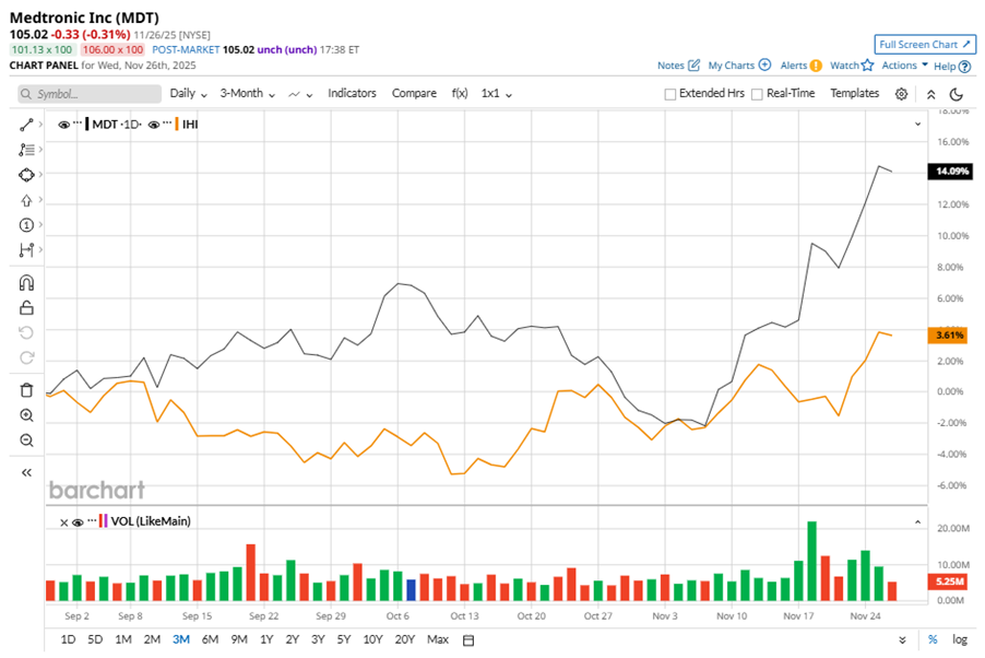 Despite its notable strength, MDT shares touched their 52-week high of $106.33 in the last trading session. Over the past three months, MDT stock gained 13.9%, outperforming the iShares U.S. Medical Devices ETF’s (IHI) 3.4% gains during the same time frame.