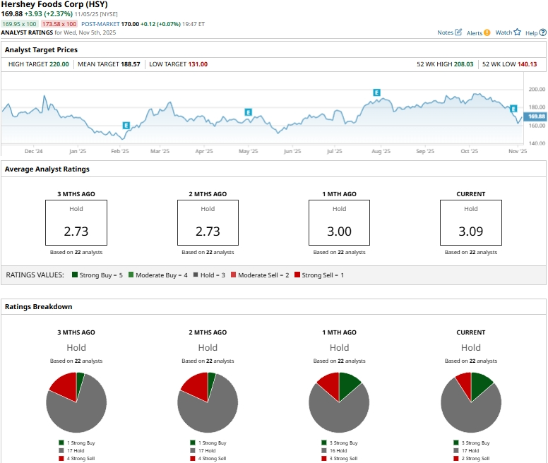 On Nov. 1, TD Cowen analyst Robert Moskow reiterated a “Hold” rating on HSY, but lowered the price target from $204 to $200.