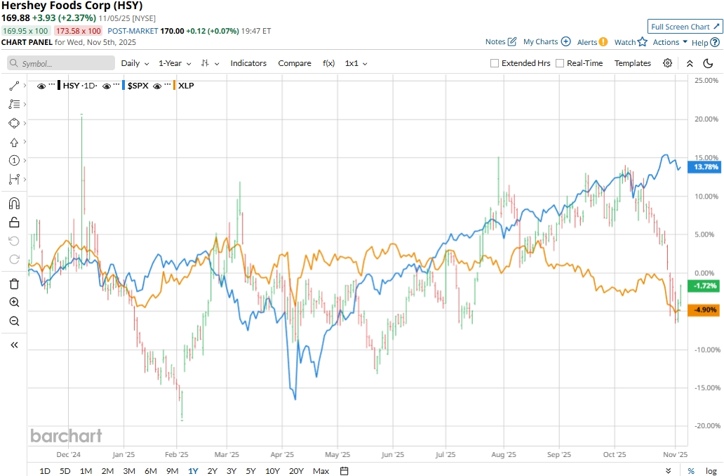 Narrowing the focus, Hershey has outpaced the sector-focused Consumer Staples Select Sector SPDR Fund’s (XLP) 3.4% dip in 2025 and 6.1% decline over the past year.