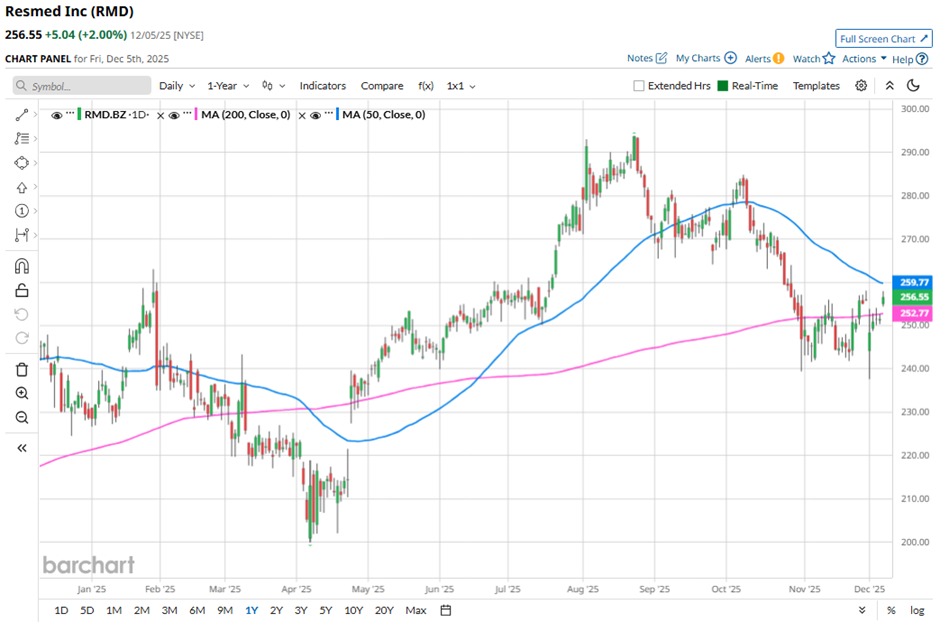 With a market cap of $37.4 billion, San Diego, California-based ResMed Inc. (RMD) develops and markets medical devices and cloud-based software for diagnosing, treating, and managing respiratory disorders worldwide. The company operates through two segments: Sleep and Breathing Health, and Residential Care Software, offering solutions ranging from sleep diagnostics and therapy devices to comprehensive healthcare software platforms.