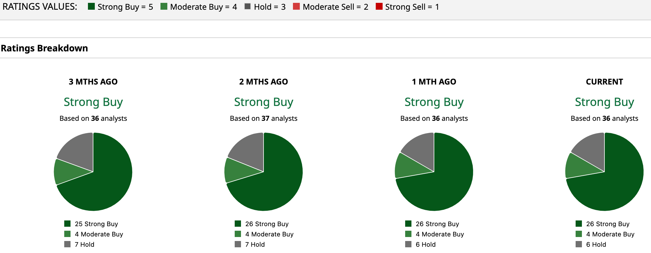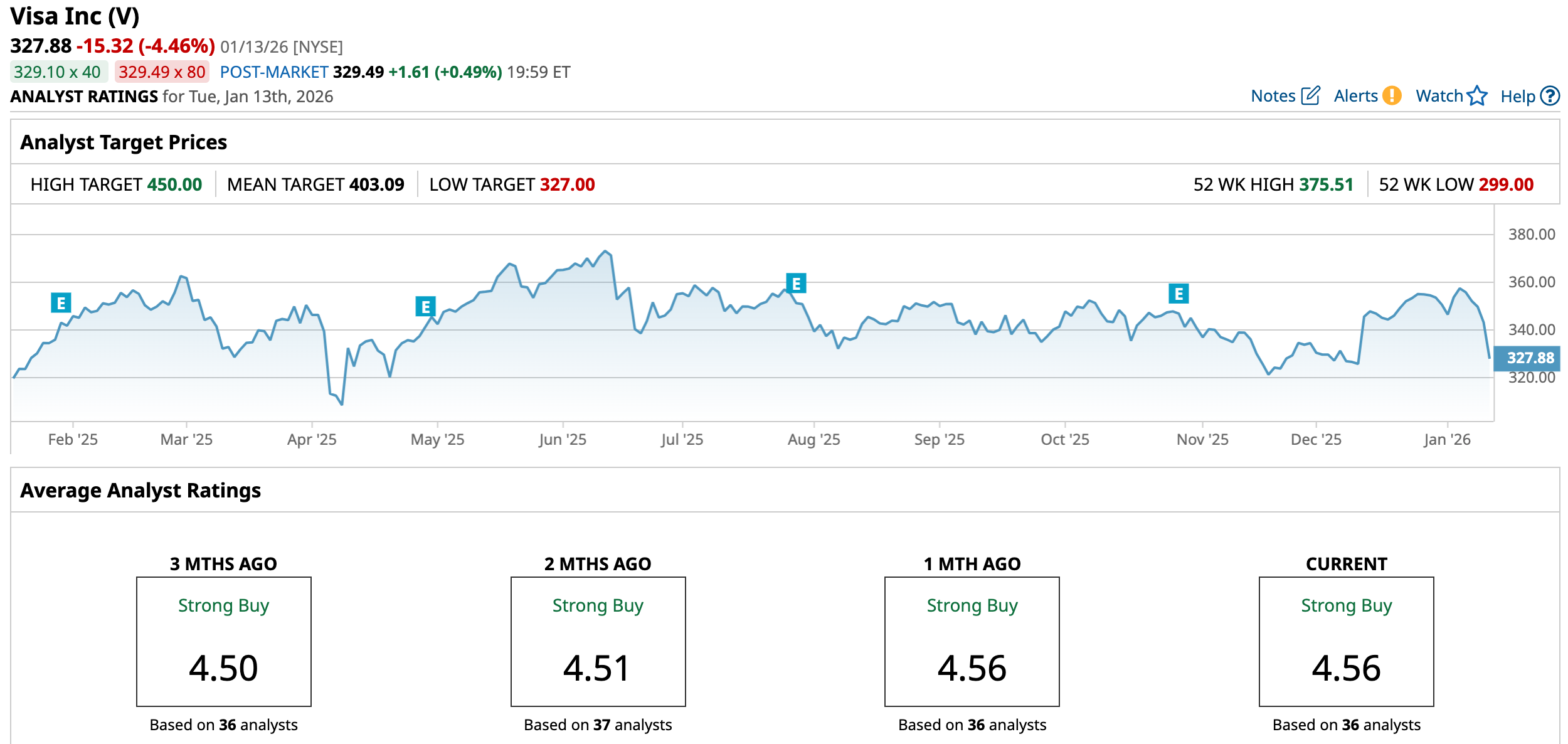 Owing to sound fundamentals, Wall Street continues to express strong conviction in Visa’s long-term outlook, assigning V stock a “Strong Buy” consensus rating. Among the 36 analysts covering the stock, 26 recommend “Strong Buy,” four suggest “Moderate Buy,” and only six advise “Hold.”