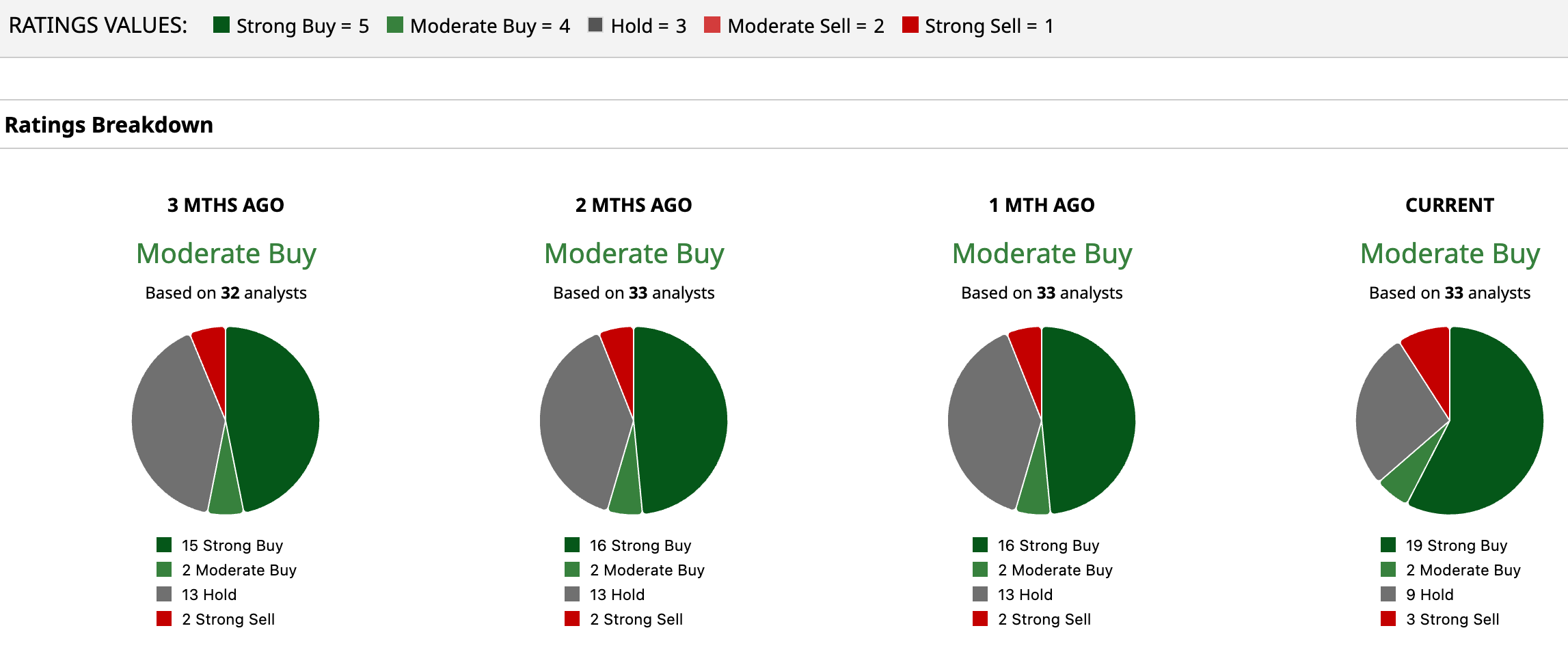 Wall Street currently assigns the stock an overall “Moderate Buy” rating. Among 33 analysts, 19 rate it a “Strong Buy,” two have assigned a “Moderate Buy,” nine recommend Hold, and three have issued a “Strong Sell.”