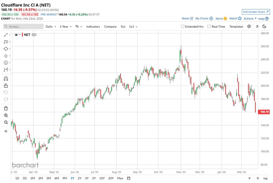 Cloudflare (NET) felt that pressure directly. The stock fell 8.1% on Feb. 20 as concerns spread that artificial intelligence (AI)-native systems may pull security further upstream, away from reactive monitoring and toward autonomous repair. Yet markets often overreact to the first headline.