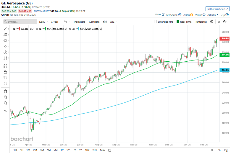 GE stock touched its 52-week high of $346.80 in the last trading session. GE stock has gained 17.5% over the past three months, trailing the State Street SPDR S&P Aerospace & Defense ETF’s (XAR) 26,5% gains over the same time frame.