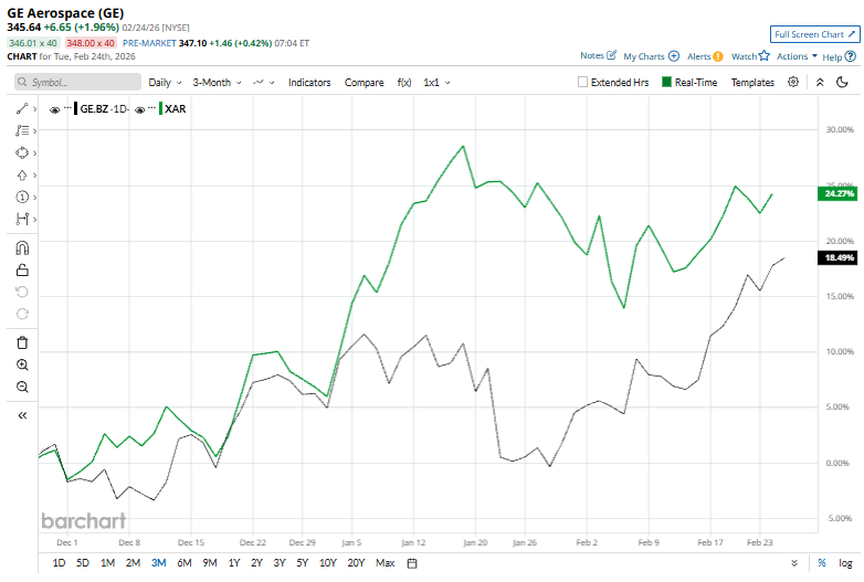 GE Aerospace has been on a sustained tear, climbing 12.2% year-to-date and 73.9% over the past year, failing to keep pace with XAR, which is up 17.3% in 2026 and 75% over the last 52 weeks.