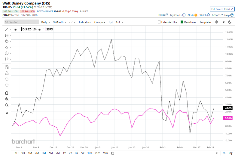 However, shares of the company have fallen 15% from its 52-week high of $124.69. Over the past three months, Walt Disney shares have soared 4%, lagging behind the S&P 500 Index’s ($SPX) 2.8% gains.