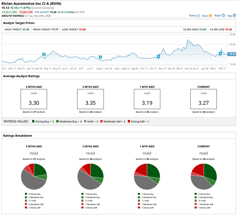 Overall, RIVN stock has a consolidated rating of “Hold” from the 23 analysts polled by Barchart, while its mean target price of $17.71 is over 17% higher than current price levels.