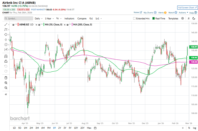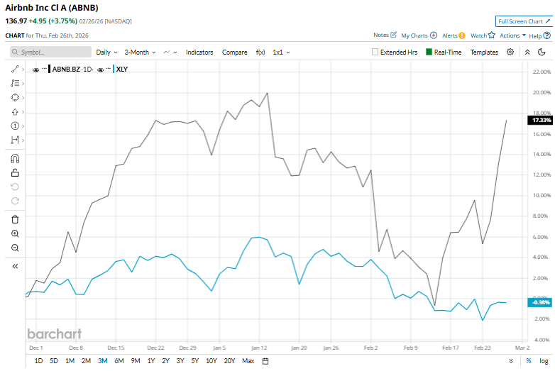 Shares of the company have pulled back 6% from its 52-week high of $145.69. Airbnb’s shares have increased 17.3% over the past three months, surpassing the Consumer Discretionary Select Sector SPDR Fund’s (XLY) marginal rise over the same time frame.