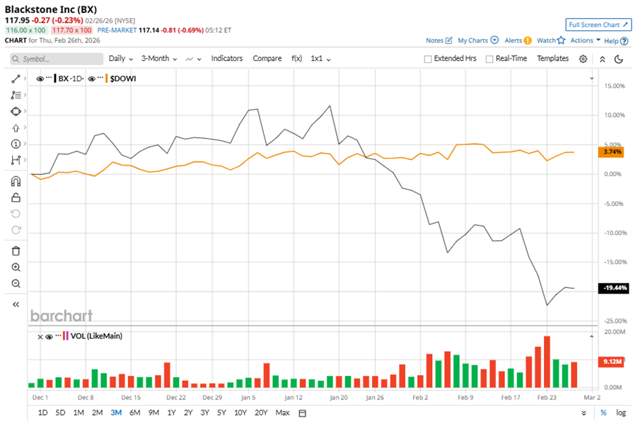 Despite its notable strength, BX slipped 38% from its 52-week high of $190.09, achieved on Sep. 18, 2025. Over the past three months, BX stock declined 18.6%, underperforming Dow Jones Industrials Average’s ($DOWI) 4.4% gains during the same time frame.