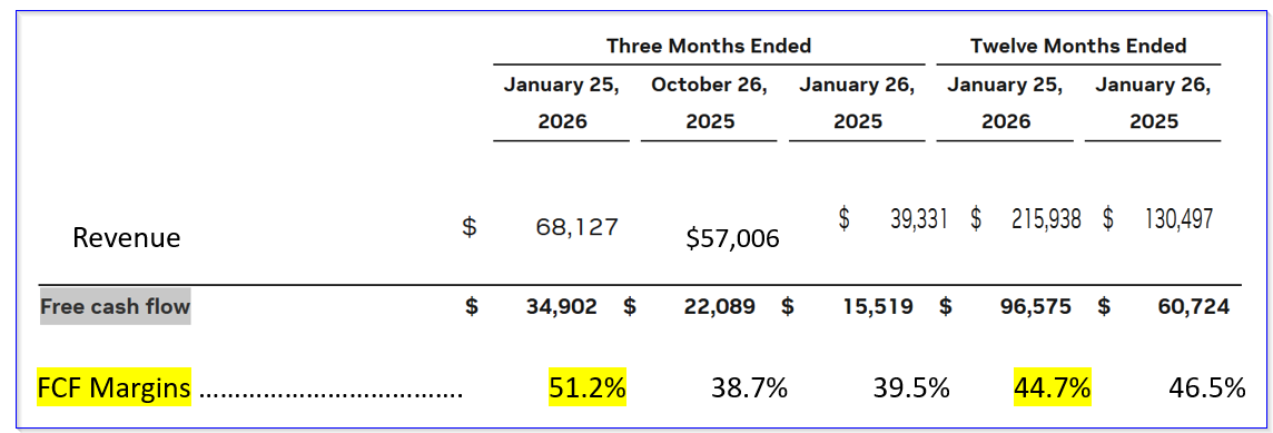 Nvidia, Inc. (NVDA) generated a massive 124% YoY growth in free cash flow (FCF) in Q4 and 59% in 2025. On Feb. 25, Nvidia's earnings release showed that its FCF margins were over 51% of sales in Q4 and 44.7% in 2025.