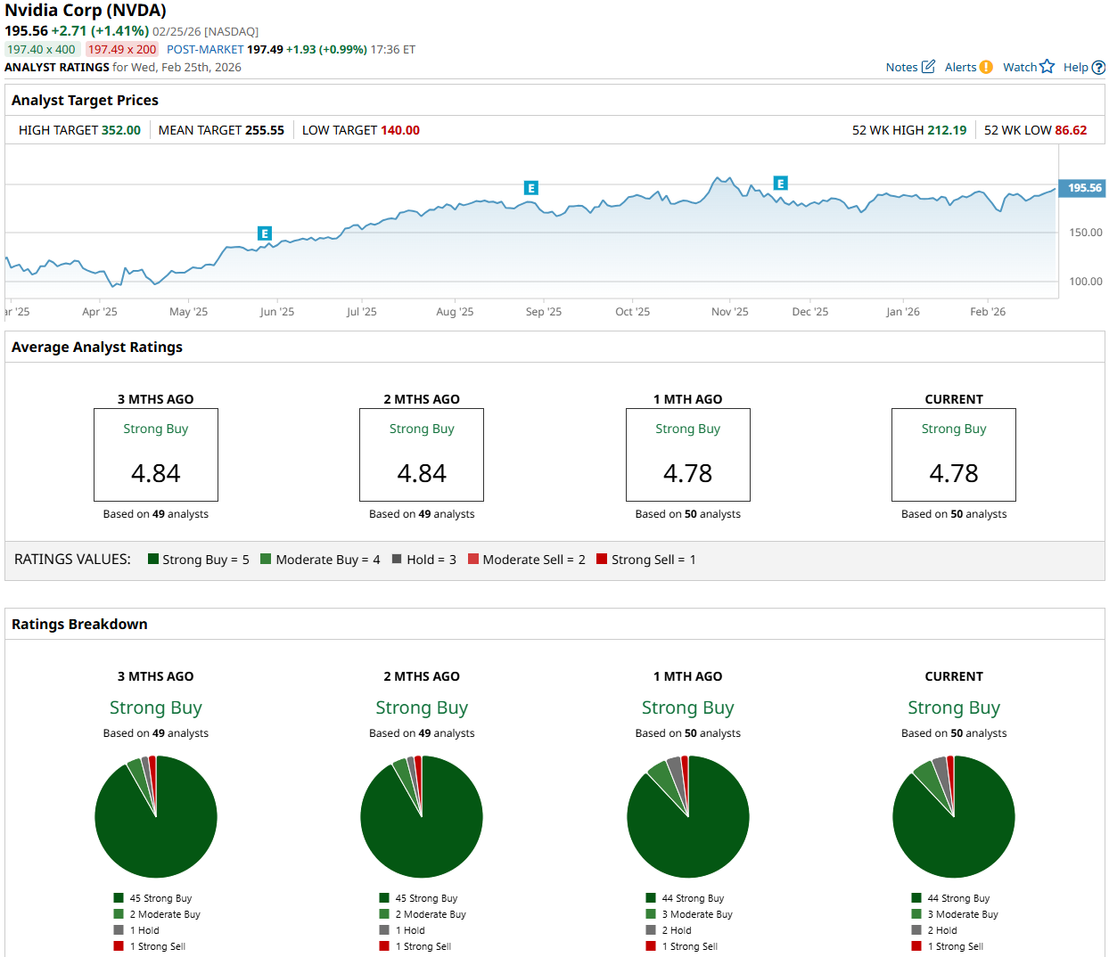 Wall Street analysts remain highly bullish on Nvidia, as reflected in NVDA stock’s top-tier “Strong Buy” consensus rating. Among the 50 analysts covering the stock, 45 rate it as a “Strong Buy,” three assign a “Moderate Buy” rating, one advises a “Hold,” and one has a “Strong Sell” rating. The average price target for NVDA stock is $255.34, implying potential upside of 44% from current levels.