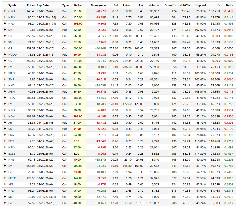 ORCL, NFLX, GS, HOOD, LMT, IREN and NKE all experienced unusual options activity last week.
