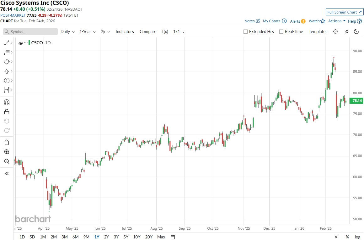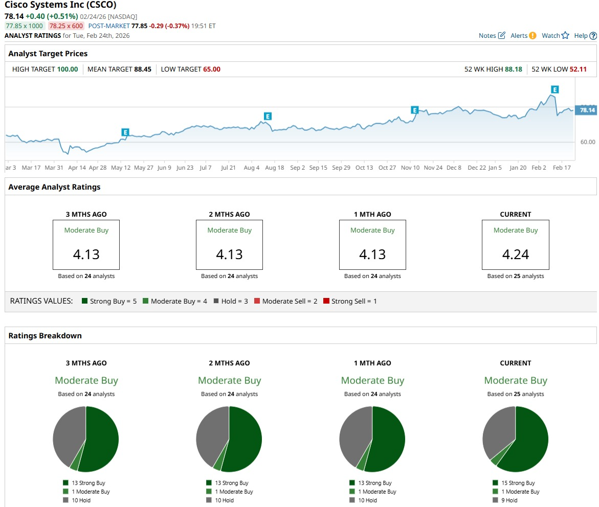 This isn’t a lone outlier call, either. A group of 25 analysts with coverage has a consensus “Moderate Buy” rating on CSCO stock. They tell the same story in numbers, as the average 12‑month price target sits at $88.45, implying roughly 11% potential upside from current levels.