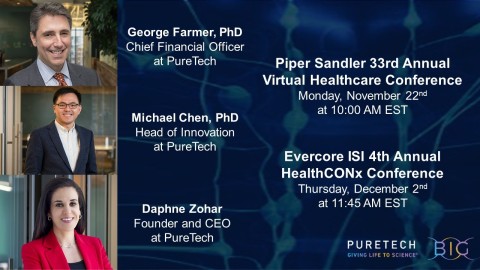Members of PureTech’s management team will participate in fireside chats at the Piper Sandler 33rd Annual Virtual Healthcare Conference and Evercore ISI 4th Annual HealthCONx Conference on Monday, November 22, and Thursday, December 2, respectively. (Photo: Business Wire)