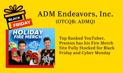 ADM Endeavors, Inc. (OTCQB: ADMQ) announced today Preston’s Fire Merch site is fully stocked and ready for Black Friday and Cyber Monday. He has launched several new products for his 18 million YouTube fans. Check out Preston’s official website here, https://firemerch.com.