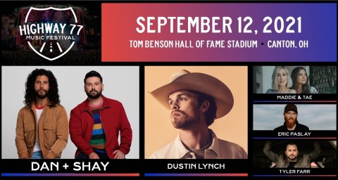 The Highway 77 Music Festival will take place on Sunday, September 12, 2021, at the Tom Benson Hall of Fame Stadium in Canton, Ohio. Dan + Shay, Justin Lynch, Maddie & Tae, Eric Paslay and Tyler Farr are among the headliners set to perform. Tickets can be purchased online by going to HOFVillage.com or by clicking here.