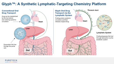 The Glyph technology is PureTech's synthetic lymphatic-targeting chemistry platform which is designed to employ the lymphatic system's natural lipid absorption and transport process to enable the oral administration of therapeutics. The Glyph technology reversibly links small molecule drugs to dietary fat molecules, creating a novel prodrug. The linked fat molecule re-routes the drug's normal path to the systemic circulation, bypassing the liver and instead moving from the gut into the lymphatic vessels that normally process dietary fats. PureTech believes this technology has the potential to (1) enable direct modulation of the immune system via drug targets present in mesenteric lymph nodes and (2) provide a broadly applicable means of enhancing the bioavailability of orally administered drugs that would otherwise be reduced by first-pass liver metabolism. PureTech is leveraging validated biology to accelerate the development of a Glyph portfolio, prioritizing highly characterized drugs to enhance with the Glyph technology based on the potential value unlocked in improving their oral bioavailability or lymphatic targeting. PureTech's lead Glyph therapeutic candidate, LYT-300 (oral allopregnanolone), is being evaluated in a Phase 1 study, with results expected in the second half of 2022. PureTech has exclusively licensed the Glyph technology platform, which is based on the pioneering research of Christopher Porter, Ph.D., and his research group at the Monash Institute of Pharmaceutical Sciences at Monash University. The Porter Research Group and collaborators have published research in Frontiers in Pharmacology, Nature Metabolism and the Journal of Controlled Release supporting the Glyph platform's ability to directly target the lymphatic system with a variety of therapies.