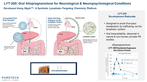 PureTech Health plc (Nasdaq: PRTC, LSE: PRTC) ("PureTech" or the "Company"), a clinical-stage biotherapeutics company dedicated to discovering, developing and commercializing highly differentiated medicines for devastating diseases, today announced the achievement of proof-of-principle for its Glyph™ platform in a healthy adult study of LYT-300 (oral allopregnanolone), PureTech’s wholly-owned therapeutic candidate for the potential treatment of a range of neurological and neuropsychological conditions. This is a key milestone for the candidate, which is designed to overcome the normally poor oral bioavailability of allopregnanolone to deliver its proven efficacy via simple, convenient oral dosing. This is also the first mechanistic proof-of-principle in the clinic for PureTech’s Glyph lymphatic targeting platform, which is designed to bypass first-pass metabolism to help maximize the therapeutic potential of validated targets and drugs where oral bioavailability has been a barrier. The Glyph platform is also designed to have additional applications through its ability to selectively traffic therapeutics into the lymphatic system, potentially enabling more direct targeting of the immune system.