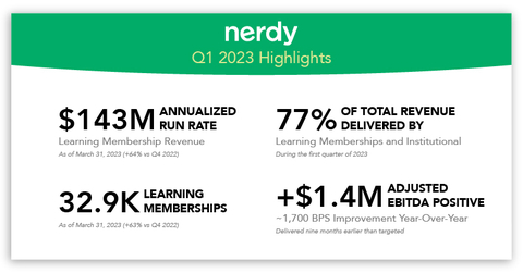 Nerdy Inc. (NYSE: NRDY) today announced financial results for the first quarter ended March 31, 2023.