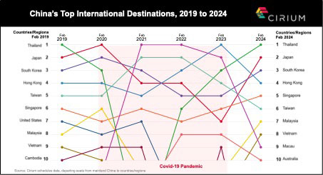 Data from Cirium reveals that China’s top 10 international destinations have largely returned to pre-pandemic rankings, with Thailand, Japan and South Korea back at the top three positions after dipping to pandemic lows in recent years. Other interesting movements in rankings include the entry of Australia and Macau, and the absence of the United States and Cambodia since February 2019.