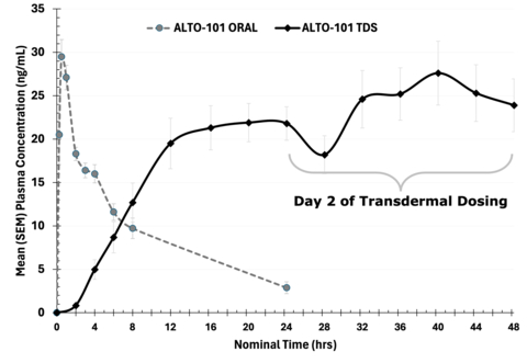 The pharmacokinetic curve illustrates stable drug exposure and achievement of the desired plasma concentration with the transdermal formulation as compared to orally administered ALTO-101. (Graphic: Alto Neuroscience, Inc.)