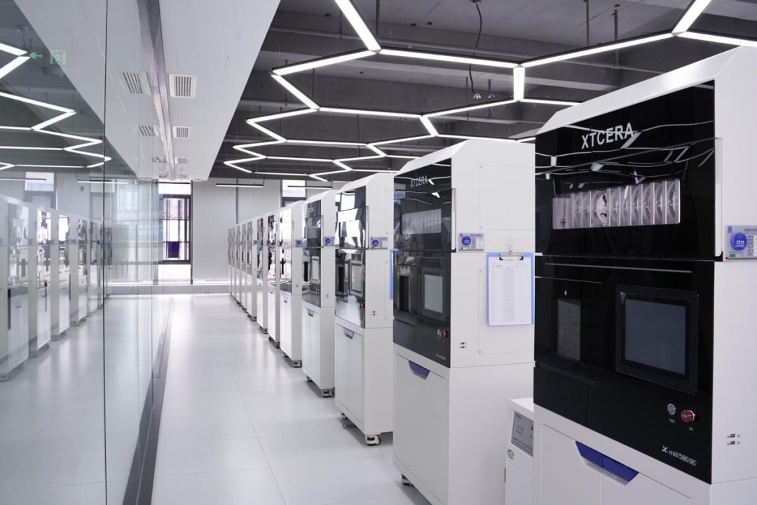 An automated system feeds raw materials into the milling unit, operating continuously to support 24-hour in-house dental production.