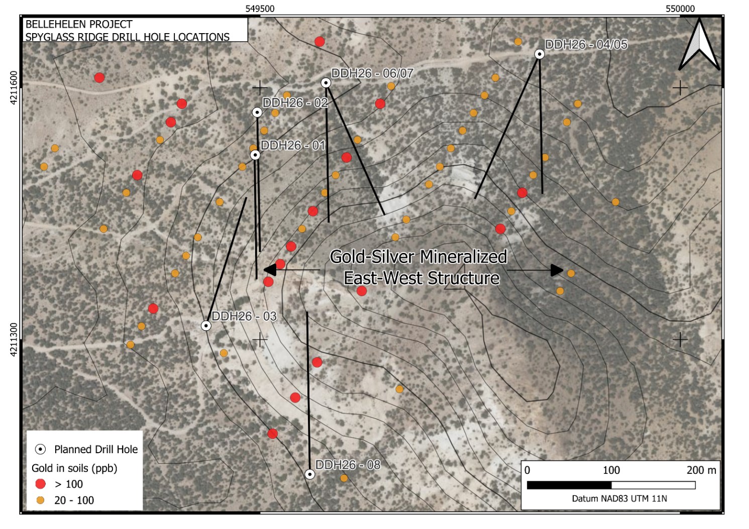 Vancouver, British Columbia--(Newsfile Corp. - February 26, 2026) - Excalibur Metals Corp. (TSXV: EXCL) ("Excalibur" or the "Company") is pleased to announce that, following the recent completion of detailed mapping and sampling coupled with a CSAMT geophysical survey and ground and airborne spectral data, the Company has finalized drill hole locations at the Bellehelen Silver-Gold Project ("Bellehelen" or the "Project") located in the Walker Lane Trend of Nevada. The drill program will consist of roughly 3,000 meters ("m") of reverse-circulation ("RC") drilling in 8 holes at the Spyglass Ridge target (see Figures 1 & 2 below). Drilling is expected to commence in mid-March 2026.