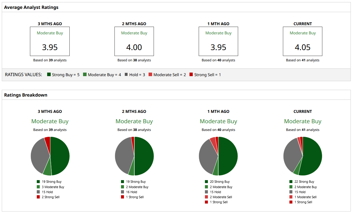 AAPL stock has a "Moderate Buy" rating consensus and a mean price target of $275.23, which implies a modest upside of around 2% at the current price of $270.79. A high price target of $345 suggests substantial gains if Apple’s hardware innovation cycle turns out well, but a low price target of $180 is a concern in terms of product mix and consumer spending.