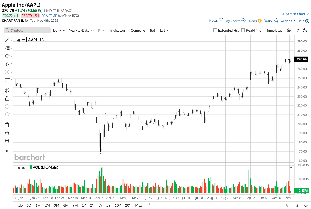 AAPL stock is currently pegged at around $271, a gain of approximately 21% in the last 52 weeks, only slightly outpacing the S&P 500 Index ($SPX) performance of 19%. Apple stock touched a high of $277.32 on Oct. 31 due to stable iPhone sales as well as the company’s entry into AI-based products.