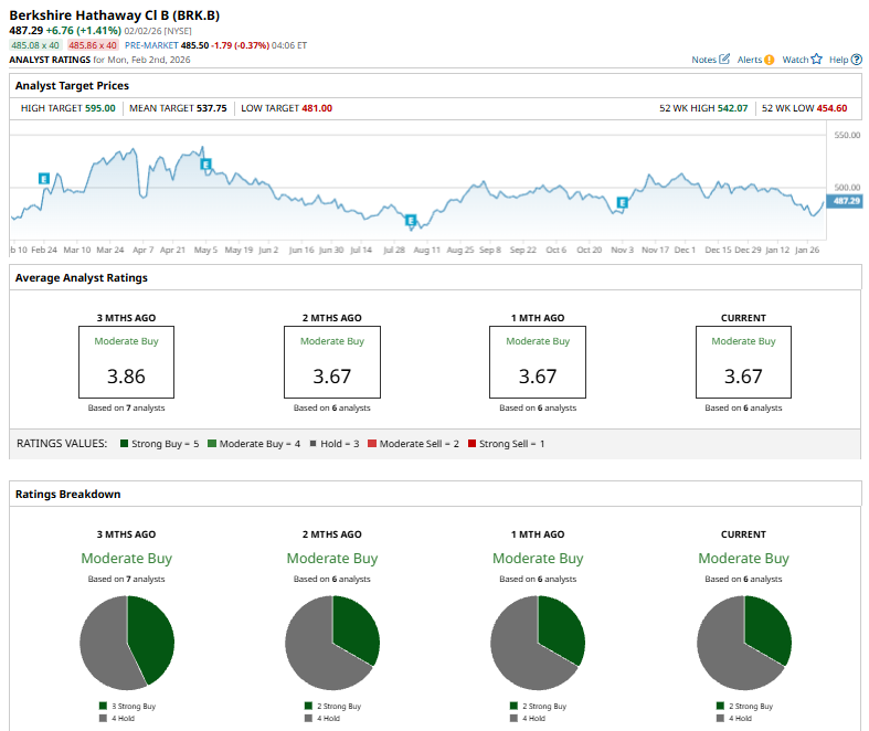 The mean price target of $537.75 represents a 10.4% premium to BRK.B’s current price levels. The Street-high price target of $595 suggests a 22.1% potential upside.