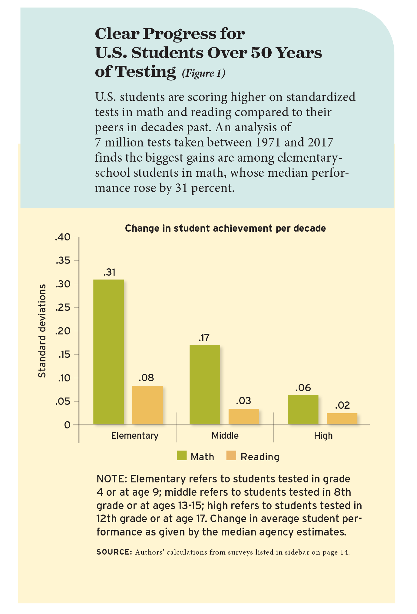 - Clear progress for U.S. students over 50 years of testing in both subjects, but steeper gains in math than reading. In math, the performances of students, on average, rose by 19 percent of a standard deviation per decade, which over 50 years amounts to nearly four additional years of learning. In reading, the gains are only 4 percent of a standard deviation, just short of about one year of additional reading over the entire period.