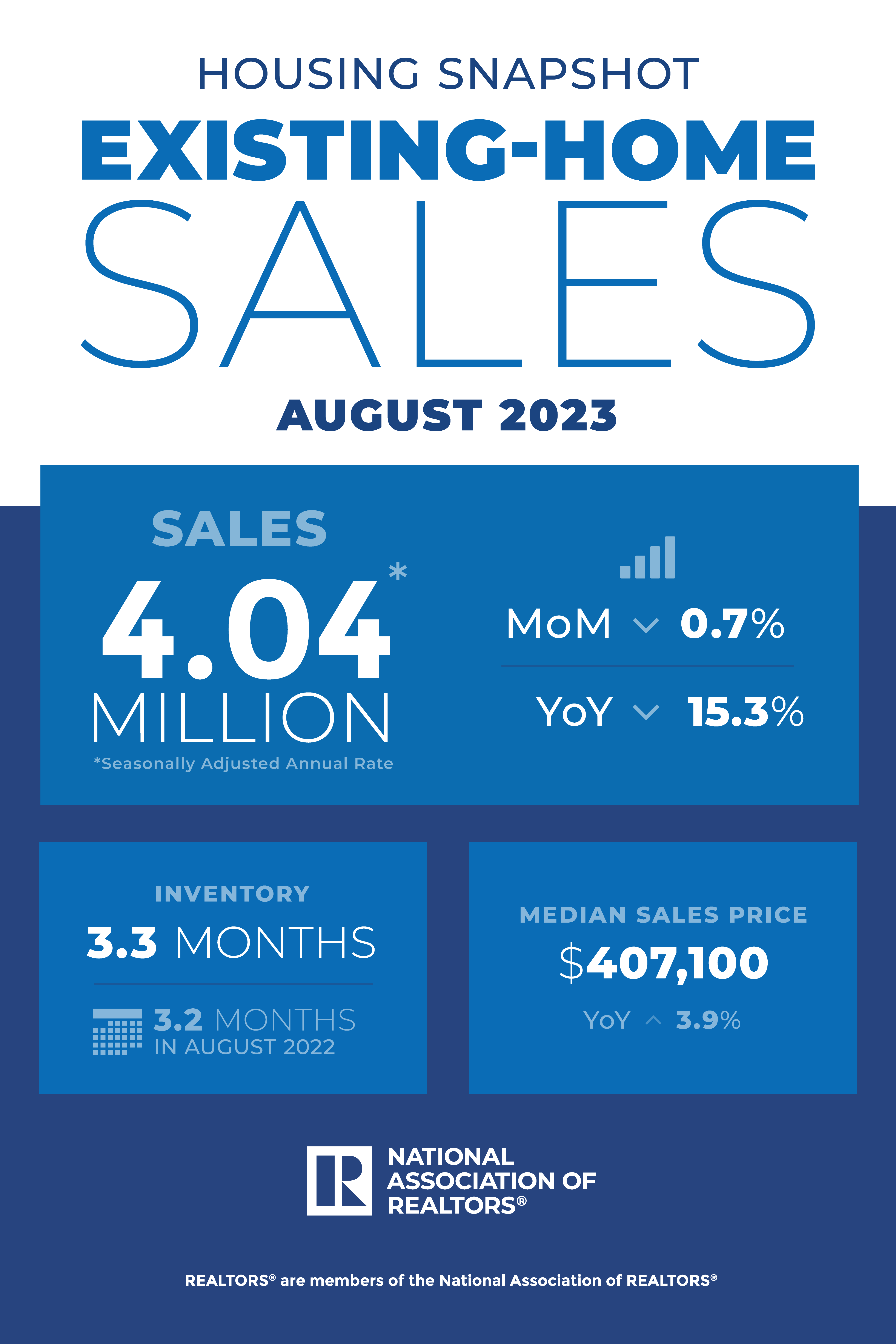 - Existing-home sales retreated 0.7% in August to a seasonally adjusted annual rate of 4.04 million. Sales dropped 15.3% from one year ago.