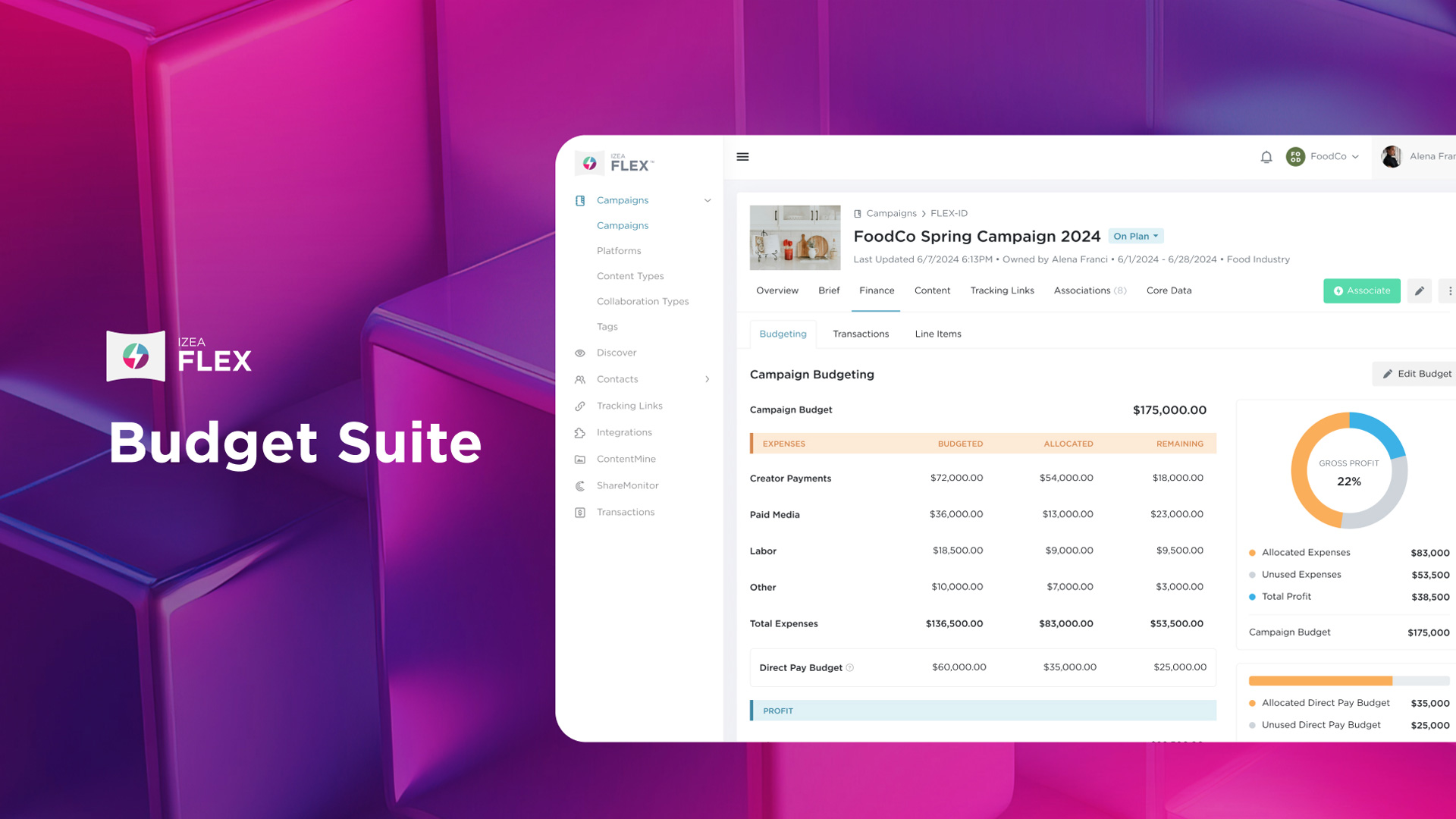 With Flex Budget Suite, agencies and brands can set a budget within each Flex campaign, accounting for expenses both inside and outside of the system. Users can allocate funds for creator payments, paid media, labor costs, and miscellaneous expenses and monitor the campaign's total expenses.