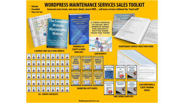 The WordPress Maintenance Services Sales Toolkit is available from BlogManagementServices.com.